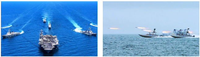 游弋在波斯灣的美軍航母戰(zhàn)斗群                          伊朗革命衛(wèi)隊在進(jìn)行戰(zhàn)斗演習(xí)