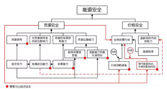 資源安全的要素包括資源擁有量、對資源擁有者的政治影響力、資源的軍事控制能力和資源運輸能力。資源擁有量本質(zhì)上取決于國家的經(jīng)濟(jì)實力,尤其是對國外資源的擁有。對資源擁有者的政治影響力是指地緣政治能力,背后的本質(zhì)支撐是經(jīng)濟(jì)實力和軍事能力,外交是實施手段,傳統(tǒng)友誼是優(yōu)勢和法寶。資源的軍事控制能力是政治的延續(xù)和最后解決手段。資源運輸能力包括海上航線和輸油管線的控制,以及造船能力和運輸船隊的擁有。