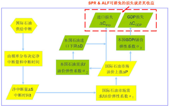 對于建立石油戰(zhàn)略儲備(SPR)或發(fā)展替代燃料(ALF),經(jīng)濟(jì)成本主要包括基礎(chǔ)設(shè)施建設(shè)成本、運行維護(hù)成本和購買資源或燃料的相關(guān)成本。對于替代燃料來說,還應(yīng)包括相關(guān)的CO2處理成本,這些成本都可以直接計算出來。建立戰(zhàn)略儲備或發(fā)展替代燃料能得到何種收益呢?答案并不顯而易見,因為這種收益只有在石油中斷的時候才能顯現(xiàn)出來[6][7],其原理如圖2所示。