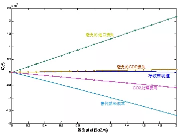 圖5展示了不同煤制油規(guī)模下的損益情況,為了特別展示由于煤基替代燃料產(chǎn)生的額外CO2的處理成本,圖中將CO2處理費用提煉出來單獨畫線。