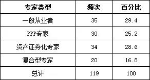 同時,受訪者在總體工作經(jīng)驗、PPP項目相關(guān)經(jīng)驗、資產(chǎn)證券化相關(guān)經(jīng)驗等方面的分布均較為分散。根據(jù)受訪者的經(jīng)驗將從業(yè)者劃分為四類:一般從業(yè)者、PPP專家、資產(chǎn)證券化專家和復(fù)合型專家,如表4所示。