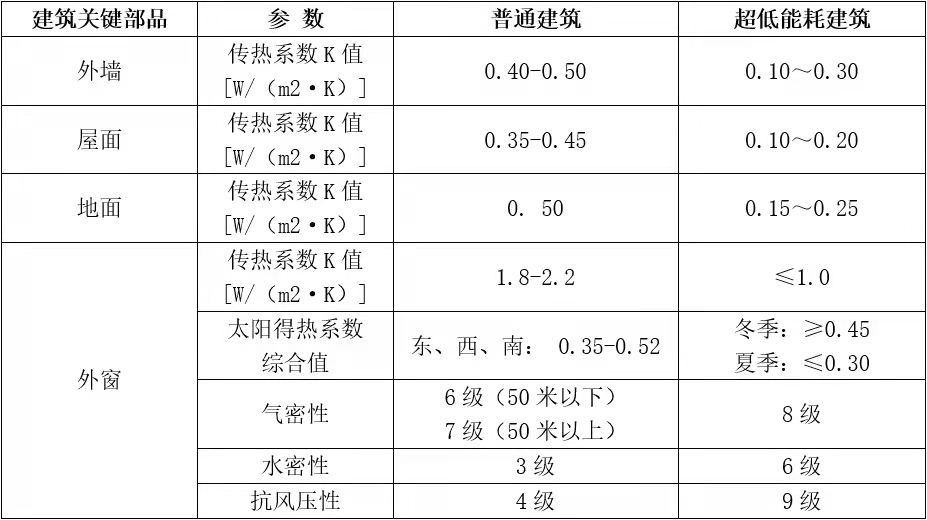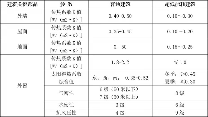 外窗是影響超低能耗建筑節(jié)能效果的關(guān)鍵部位,其影響建筑能耗的性能參數(shù)主要包括傳熱系數(shù)、太陽(yáng)能得熱系數(shù)以及氣密性。外窗應(yīng)有良好的氣密、水密及抗風(fēng)壓性能。依據(jù)國(guó)家標(biāo)準(zhǔn)《建筑外門(mén)窗氣密、水密、抗風(fēng)壓性能分級(jí)及檢測(cè)方法》(GB/T 7106-2019),外窗氣密性等級(jí)不低于8級(jí),水密性等級(jí)不低于6級(jí),抗風(fēng)壓性能等級(jí)不低于9級(jí)。[2]北京地區(qū)超低能耗建筑與普通建筑的保溫系統(tǒng)對(duì)比參數(shù)見(jiàn)下表。