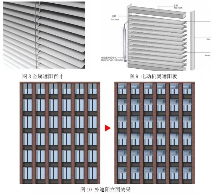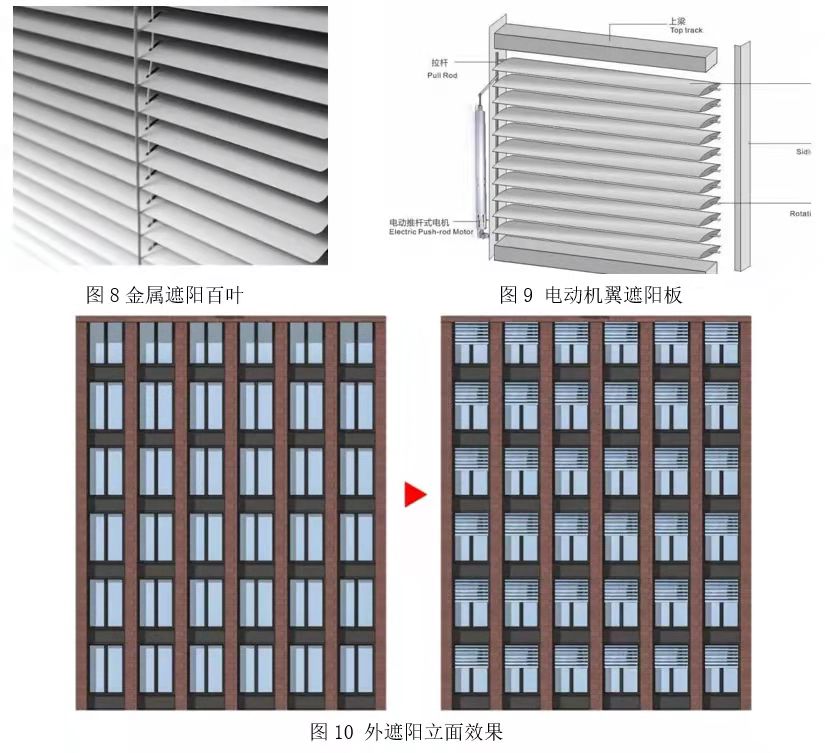 該項(xiàng)目南北向布置,平面基本為正方形,外立面風(fēng)格簡(jiǎn)潔,可以通過(guò)增加可調(diào)節(jié)遮陽(yáng)措施使立面效果更加豐富。立面遮陽(yáng)可以采用活動(dòng)金屬遮陽(yáng)百葉或機(jī)翼遮陽(yáng)板(圖8、圖9)。機(jī)翼遮陽(yáng)板可以根據(jù)太陽(yáng)高度角的變化自動(dòng)調(diào)節(jié)進(jìn)入室內(nèi)的太陽(yáng)能量,降低空調(diào)能耗??烧{(diào)節(jié)外遮陽(yáng)和外窗間距大于100毫米,以免外窗玻璃被加熱,導(dǎo)致熱傳導(dǎo),增加能耗。[9]可調(diào)節(jié)遮陽(yáng)控制方式可以選擇手動(dòng)操作、無(wú)感光自動(dòng)控制、電動(dòng)控制且與樓宇控制系統(tǒng)聯(lián)動(dòng)等形式。