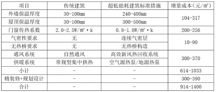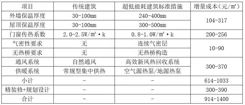 但是,超低能耗建筑的施工工藝比傳統(tǒng)建筑更加復(fù)雜,對(duì)施工程序和質(zhì)量要求更加嚴(yán)格;在運(yùn)行管理過(guò)程中,需要管理部門(mén)和用戶的參與和配合,避免不當(dāng)行為使建筑節(jié)能效率下降,避免二次裝修對(duì)氣密層的破壞。[7]通過(guò)超低能耗建筑與普通建筑的數(shù)據(jù)比較分析,超低能耗建筑對(duì)保溫材料、門(mén)窗及高熱回收裝置等產(chǎn)品的要求遠(yuǎn)遠(yuǎn)高于普通建筑,因此,超低能耗建筑的成本造價(jià)遠(yuǎn)高于普通建筑。