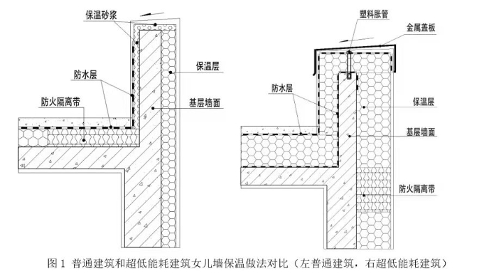 熱橋往往會(huì)出現(xiàn)在不同材料連接處和結(jié)構(gòu)變化部位,如女兒墻、挑出樓板、管道穿屋面等位置。普通建筑在女兒墻等突出屋面的位置保溫層一般不連續(xù)設(shè)置,只是在沒(méi)有保溫層的位置用30厚的憎水膨珠漿料等保溫砂漿將其連續(xù)起來(lái),避免建筑內(nèi)表面發(fā)霉、結(jié)露。超低能耗建筑在女兒墻等薄弱環(huán)節(jié)其保溫層應(yīng)與屋面、墻面連續(xù)設(shè)置,在頂部設(shè)置金屬蓋板,以提高其耐久性,而且保溫層固定應(yīng)采取斷熱橋錨栓等避免熱橋的措施,二者做法對(duì)比如圖1所示。