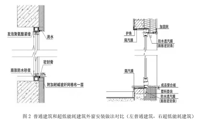 超低能耗建筑外窗安裝方式與普通建筑的外窗安裝方式有較大區(qū)別。普通建筑窗戶安裝在砌體結(jié)構(gòu)上,保溫層中斷;超低能耗建筑外窗安裝時(shí)應(yīng)將外窗框的熱橋損失降到最低,外窗框內(nèi)表面和結(jié)構(gòu)外表面齊平,采用外懸式安裝方式,將窗戶安裝在保溫層內(nèi),外墻保溫層多包住窗框,并且用專用成品連接件進(jìn)行連接,保證保溫層連續(xù)無(wú)中斷。二者做法對(duì)比如圖2所示。