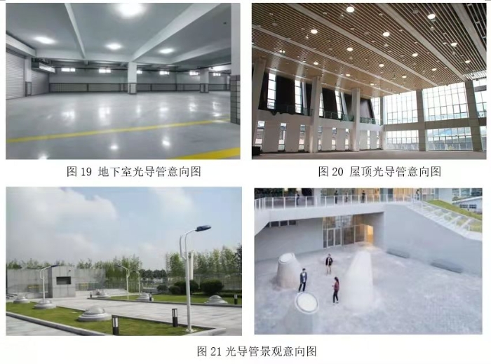除節(jié)能燈具外,地下二層北側(cè)車(chē)庫(kù)和九層網(wǎng)球館屋頂利用自然采光的原理,采用光導(dǎo)管采光系統(tǒng),通過(guò)采光罩高效采集室外自然光線并導(dǎo)入系統(tǒng)內(nèi)重新分配,再經(jīng)過(guò)特殊制作的導(dǎo)光管傳輸后由底部的漫射裝置把自然光均勻高效的照射到地下室。該裝置主要由三部分組成:采光裝置、導(dǎo)光裝置、漫射裝置。[10]出地面或屋面的采光裝置可以結(jié)合景觀布置。