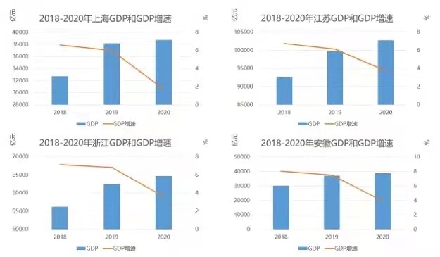 圖1 2018-2020年長三角地區(qū)GDP和GDP增速情況
