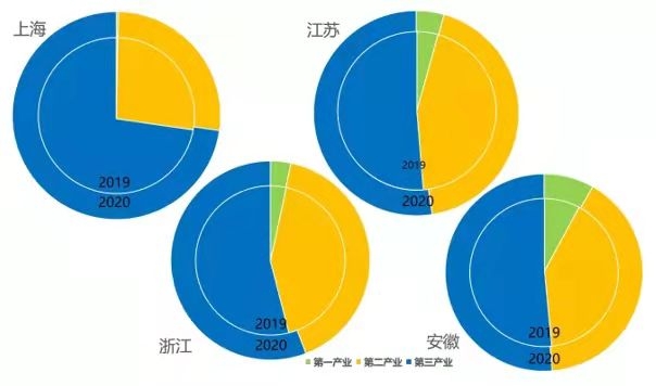 2020年,長三角地區(qū)生產(chǎn)總值占全國的比重達(dá)到24.1%,同比提升0.2個(gè)百分點(diǎn),在全國經(jīng)濟(jì)總量中的比重不斷上升。產(chǎn)業(yè)結(jié)構(gòu)進(jìn)一步優(yōu)化,第三產(chǎn)業(yè)占比均超過了50%,其中,服務(wù)業(yè)發(fā)展勢(shì)頭強(qiáng)勁,工業(yè)經(jīng)濟(jì)明顯好轉(zhuǎn),戰(zhàn)略性新興產(chǎn)業(yè)加速成長,重點(diǎn)行業(yè)表現(xiàn)突出。但省際之間產(chǎn)業(yè)結(jié)構(gòu)、產(chǎn)業(yè)體系和重點(diǎn)產(chǎn)業(yè)發(fā)展情況仍存在明顯的地區(qū)差異,其中,上海的第三產(chǎn)業(yè)比重超過70%,安徽的第三產(chǎn)業(yè)比重超過50%。
