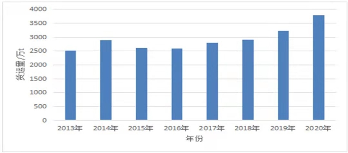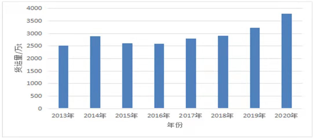 2016年以來格爾木的貨物運輸量保持穩(wěn)定增長(見圖2),年平均增長率約為10%。2020年,格爾木市的貨物運輸量達到了3794.24萬t,其中鐵路、公路是主要的運輸方式,分別完成了1747.24萬t、2046.81萬t的貨物運輸量;民航完成貨郵吞吐量1879.10t。鐵路貨運量隨著格爾木的中轉(zhuǎn)物流、產(chǎn)業(yè)升級、消費物流、“一帶一路”等外向型經(jīng)濟的發(fā)展以及區(qū)域路網(wǎng)的逐步完善,物流總需求量將會進一步提升。