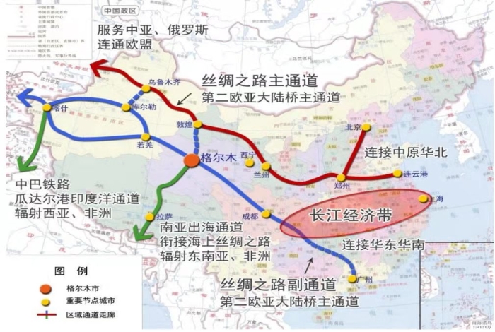 格爾木地處青藏高原腹地,位于祖國西部的地理中心,是國家穩(wěn)藏固疆的戰(zhàn)略要沖、加強西南邊防建設(shè)的保障基地。2015年,青海省委、省政府出臺了深度融入“一帶一路”建設(shè)構(gòu)建對外開放新格局的實施意見,格爾木被確定為青海省對外開放節(jié)點城市之一。2017年1月,國家發(fā)展和改革委員會發(fā)布了《西部大開發(fā)“十三五”規(guī)劃》,構(gòu)畫出西部開發(fā)“五橫兩縱一環(huán)”總體空間格局,格爾木市被確定為京藏通道西段節(jié)點城市,支撐青海藏區(qū)發(fā)展的新增長極。2017年2月,國務(wù)院發(fā)布了《“十三五”現(xiàn)代綜合交通運輸體系發(fā)展規(guī)劃》,格爾木被列為全國性綜合交通樞紐。2018年,國家發(fā)展改革委、交通運輸部發(fā)布了《國家物流樞紐布局和建設(shè)規(guī)劃》,格爾木被規(guī)劃為陸港型國家物流樞紐承載城市。