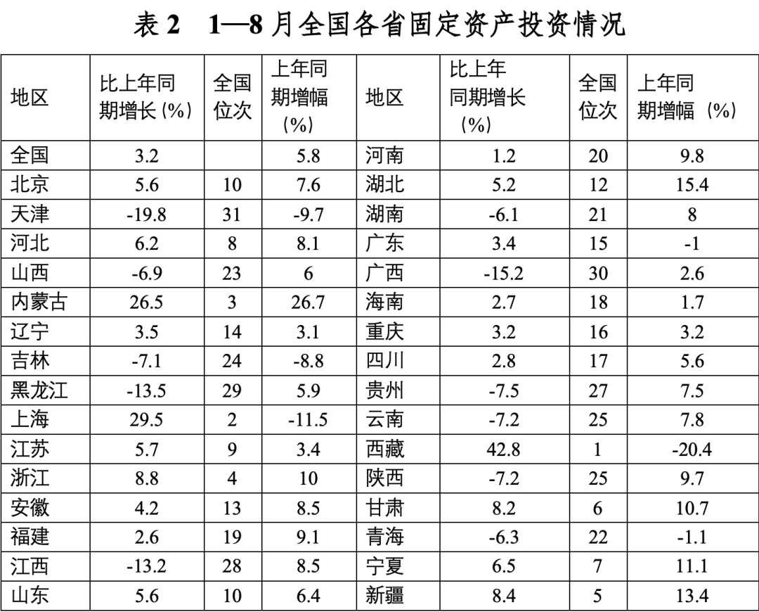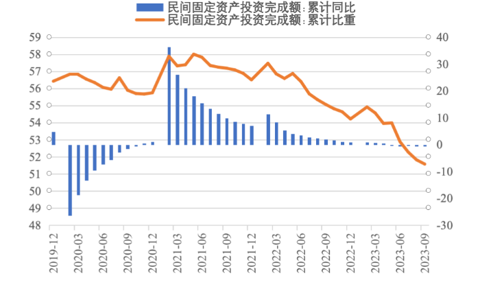 2023年前三季度,我國經(jīng)濟(jì)運行持續(xù)恢復(fù)向好,投資對優(yōu)化供給結(jié)構(gòu)的關(guān)鍵作用顯著增強,高技術(shù)產(chǎn)業(yè)投資保持較快增長,基礎(chǔ)設(shè)施投資、制造業(yè)投資穩(wěn)投資支撐作用進(jìn)一步發(fā)揮。同時,當(dāng)前穩(wěn)投資也面臨新的困難挑戰(zhàn),尤其是房地產(chǎn)市場深度調(diào)整導(dǎo)致房地產(chǎn)開發(fā)投資和民間投資承受較大下行壓力。下一步仍需精準(zhǔn)有力加強逆周期調(diào)控,不斷拓展促投資政策空間,重點圍繞提振房地產(chǎn)市場、推動制造業(yè)轉(zhuǎn)型升級、激發(fā)民間投資活力等方面,繼續(xù)夯實投資復(fù)蘇基礎(chǔ)。 一、固定資產(chǎn)投資整體運行情況 (一)整體投資保持平穩(wěn)增長態(tài)勢 2023年1—9月,我國固定資產(chǎn)投資(不含農(nóng)戶,下同)375035億元,同比增長3.1%,較國內(nèi)生產(chǎn)總值增速低了2.1個百分點,較上半年增速低了0.7個百分點,固定資產(chǎn)投資增速持續(xù)放緩。從投資構(gòu)成看,上半年建安工程、設(shè)備工器具購置、其他費用分別增長2.4%、6.8%、3.1%。設(shè)備工器具購置保持較快增長,反映在各類政策工具支持引導(dǎo)下,企業(yè)設(shè)備購置、技術(shù)改造投入力度加大。 圖1 全國固定資產(chǎn)投資增速(%) 數(shù)據(jù)來源:國家統(tǒng)計局 (二)民間投資意愿和能力仍待恢復(fù) 2023年1—9月,民間固定資產(chǎn)投資為193399億元,同比下降0.6%,較上半年低了0.4個百分點,低于投資整體增速3.7個百分點。從季度波動看,民間固定資產(chǎn)投資的增速由2022年第一季度的8.4%持續(xù)下滑,并連續(xù)兩個季度負(fù)增長。民間固定資產(chǎn)投資占比進(jìn)一步萎縮,跌至2011年以來的最低點,僅為51.57%。 圖2 民間投資增速及占比(%) 數(shù)據(jù)來源:國家統(tǒng)計局,Wind數(shù)據(jù)庫 國家統(tǒng)計局發(fā)布信息顯示,房地產(chǎn)投資中約80%為民間投資。受房地產(chǎn)市場深度調(diào)整影響,民間投資動力和能力相對不足,國有及國有控股單位投資增速連續(xù)20個月高于民間投資增速。2023年1—9月,國有及國有控股單位同比增長7.2%,較民間投資增速高了7.8個百分點。 圖3 民間投資、國有及國有控股單位投資增速(%) 數(shù)據(jù)來源:國家統(tǒng)計局,Wind數(shù)據(jù)庫 (三)制造業(yè)投資保持較快增長,基礎(chǔ)設(shè)施補短板投入加大 2023年1—9月,制造業(yè)和基建投資保持較快增長,房地產(chǎn)投資持續(xù)負(fù)增長,且降幅有所擴(kuò)大?;A(chǔ)設(shè)施投資在專項債等融資支持政策以及重大項目支撐下,效果持續(xù)顯現(xiàn),前三季度基礎(chǔ)設(shè)施投資同比增長8.64%,高于全部投資5.54個百分點,是三大類投資中增長最快的領(lǐng)域。其中,鐵路運輸業(yè)、倉儲業(yè)投資分別大幅增長22.1%、27.7%。截至9月底,新增地方政府專項債已發(fā)行超過3.1萬億元,完成全年專項債額度的80%以上,對基礎(chǔ)設(shè)施投資形成較強支撐。1—9月份,計劃總投資億元及以上項目投資同比增長10.2%,較1—8月快了0.3個百分點,對全部投資增長的貢獻(xiàn)率達(dá)169.2%,大項目投資帶動作用明顯。 數(shù)據(jù)來源:國家統(tǒng)計局,Wind數(shù)據(jù)庫 2023年1—9月,制造業(yè)投資同比增長6.2%,比整體投資高3.1個百分點。其中,高技術(shù)制造業(yè)投資同比增長11.3%,對制造業(yè)投資拉動作用明顯,表明我國制造業(yè)加速轉(zhuǎn)型升級。9月,制造業(yè)采購經(jīng)理指數(shù)(PMI)為50.2%,比上月上升0.5個百分點,重返擴(kuò)張區(qū)間。生產(chǎn)指數(shù)和新訂單指數(shù)均高于臨界點,分別為52.7%和50.5%,表明制造業(yè)生產(chǎn)和市場需求穩(wěn)步回升。裝備制造業(yè)、高技術(shù)制造業(yè)PMI分別為50.6%、50.1%,均位于擴(kuò)張區(qū)間。從企業(yè)規(guī)??矗?、中、小型企業(yè)PMI分別為51.6%、49.6%和48%,其中大型企業(yè)PMI較上月回升0.8個百分點,為近6個月高點,表現(xiàn)出強勁恢復(fù)發(fā)展動能。 圖4:制造業(yè)PMI指數(shù)(%) 數(shù)據(jù)來源:國家統(tǒng)計局,Wind數(shù)據(jù)庫 2023年1—9月,房地產(chǎn)開發(fā)投資增速持續(xù)放緩,房地產(chǎn)開發(fā)投資、住宅開發(fā)投資分別同比下降9.1%、8.4%。房地產(chǎn)開發(fā)投資占固定資產(chǎn)投資完成額的比重降至23.3%,較上半年下降0.8個百分點,為今年以來最低值。房屋施工面積、房屋新開工面積等先行指標(biāo)均出現(xiàn)明顯下滑,分別同比下降7.1%、23.4%。1—9月,國房景氣指數(shù)均位于100以下,自4月以來持續(xù)走低。 圖5 三大領(lǐng)域固定資產(chǎn)投資增速(累計同比,%) 數(shù)據(jù)來源:國家統(tǒng)計局,Wind數(shù)據(jù)庫 (四)東部地區(qū)投資保持較快增長,東北地區(qū)投資下滑明顯 從投資地域看,三季度東北地區(qū)投資轉(zhuǎn)為負(fù)增長,1—9月累計同比下降2.7%,較全國水平低了5.8個百分點。東部地區(qū)投資同比增長5.4%,保持較高增速。西部地區(qū)投資同比微降0.4%,增速由正轉(zhuǎn)負(fù)。中部地區(qū)投資同比下降0.9%,降幅較上半年收窄0.8個百分點。 圖6 分地區(qū)固定資產(chǎn)投資增速(累計同比,%) 數(shù)據(jù)來源:國家統(tǒng)計局,Wind數(shù)據(jù)庫 1—8月,31個省份中有15個省投資增速高于全國水平,其中西藏、上海、內(nèi)蒙古等3省實