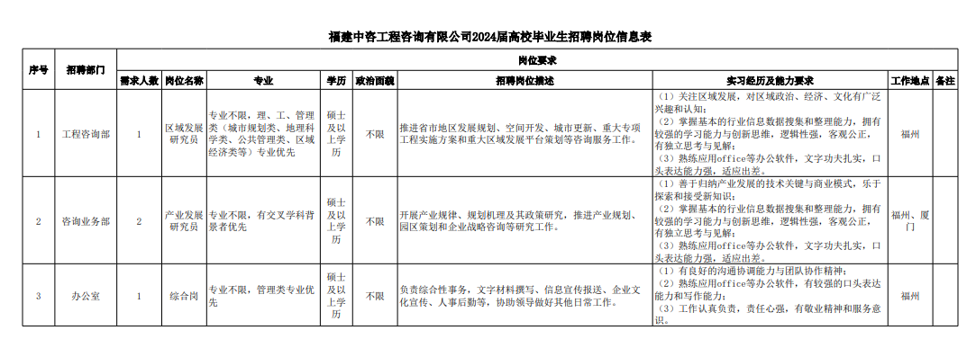 福建中咨工程咨詢有限公司招聘崗位信息