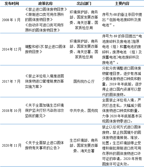 相比之下,近年來我國在廢舊電池進口政策上日益趨嚴,逐漸收緊了所有固體廢料的進口。具體如表3所示。
