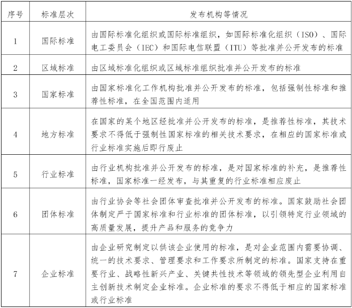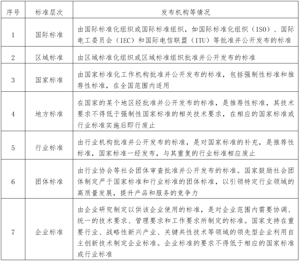 根據(jù)GB/T 20000.1-2014的相關(guān)規(guī)定,按照標(biāo)準(zhǔn)化所涉及的地理、政治或經(jīng)濟(jì)區(qū)域的范圍,可將標(biāo)準(zhǔn)化分為國(guó)際、區(qū)域、國(guó)家、行業(yè)、地方、團(tuán)體和企業(yè)等層次。即標(biāo)準(zhǔn)化可在全球、區(qū)域或國(guó)家層次上,在一個(gè)國(guó)家的某個(gè)地區(qū)內(nèi),在政府部門(mén)、行業(yè)協(xié)會(huì)或企業(yè)層次上,以至于在企業(yè)內(nèi)部業(yè)務(wù)處室等各個(gè)不同層次上進(jìn)行。根據(jù)標(biāo)準(zhǔn)發(fā)布機(jī)構(gòu)隸屬的標(biāo)準(zhǔn)化層級(jí),可將標(biāo)準(zhǔn)分為國(guó)際、區(qū)域、國(guó)家、行業(yè)、地方、團(tuán)體、企業(yè)標(biāo)準(zhǔn)等層次。《中華人民共和國(guó)標(biāo)準(zhǔn)化法》明確企業(yè)標(biāo)準(zhǔn)的技術(shù)要求不得低于強(qiáng)制性國(guó)家標(biāo)準(zhǔn),鼓勵(lì)企業(yè)制定高于推薦性標(biāo)準(zhǔn)(包括推薦性國(guó)家標(biāo)準(zhǔn)、行業(yè)標(biāo)準(zhǔn)、地方標(biāo)準(zhǔn)、團(tuán)體標(biāo)準(zhǔn))相關(guān)技術(shù)要求的企業(yè)標(biāo)準(zhǔn)。我國(guó)要求實(shí)施標(biāo)準(zhǔn)化工作領(lǐng)跑者計(jì)劃,鼓勵(lì)領(lǐng)先型企業(yè)制定發(fā)布高于國(guó)家標(biāo)準(zhǔn)、行業(yè)標(biāo)準(zhǔn)、地方標(biāo)準(zhǔn)、團(tuán)體標(biāo)準(zhǔn)要求的企業(yè)標(biāo)準(zhǔn)。