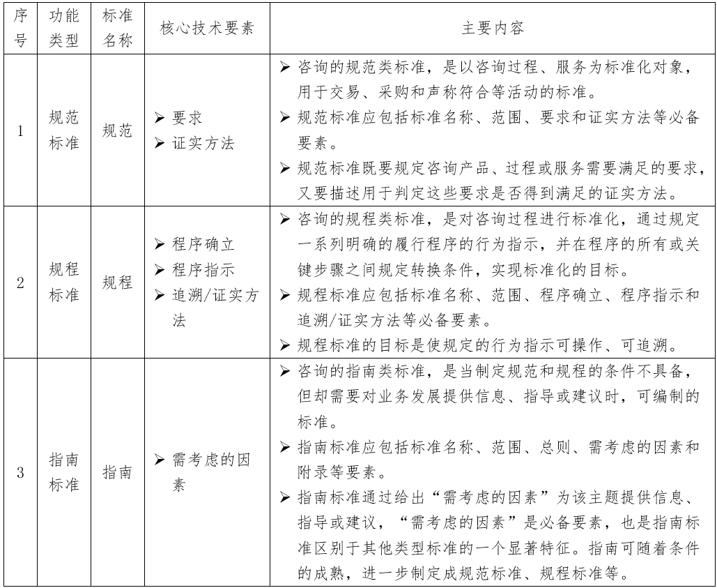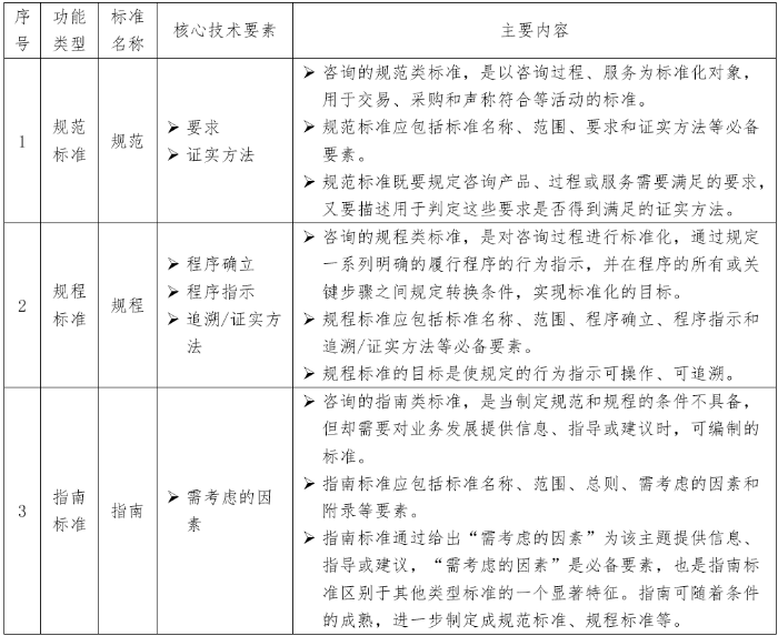 GB/T 20000.1-2014對(duì)標(biāo)準(zhǔn)的定義為:“通過(guò)標(biāo)準(zhǔn)化活動(dòng)按照規(guī)定的程序經(jīng)協(xié)商一致制定, 為各種活動(dòng)或其結(jié)果提供規(guī)則、指南或特性, 供共同使用和重復(fù)使用的文件,諸如標(biāo)準(zhǔn)、技術(shù)規(guī)范、可公開(kāi)獲得規(guī)范、技術(shù)報(bào)告等?!敝凶晒咀稍儤I(yè)務(wù)標(biāo)準(zhǔn)化文件,主要指公司的各類咨詢業(yè)務(wù)標(biāo)準(zhǔn),是公司咨詢業(yè)務(wù)需要統(tǒng)一的技術(shù)要求。從功能分類看,業(yè)務(wù)標(biāo)準(zhǔn)主要包括規(guī)范性、規(guī)程性或指南類標(biāo)準(zhǔn)。其中規(guī)范標(biāo)準(zhǔn)一般指為工程咨詢產(chǎn)品或服務(wù)規(guī)定需要滿足的要求以及采取何種方法對(duì)其是否滿足相關(guān)要求進(jìn)行驗(yàn)證;規(guī)程標(biāo)準(zhǔn)一般是對(duì)工程咨詢產(chǎn)品或服務(wù)過(guò)程規(guī)定一系列明確的履行程序,并在程序的所有或關(guān)鍵步驟之間規(guī)定轉(zhuǎn)換條件;指南標(biāo)準(zhǔn)一般以適當(dāng)?shù)谋尘爸R(shí)提供相關(guān)工程咨詢服務(wù)的普遍性、原則性、方向性指導(dǎo)并給出相關(guān)建議。規(guī)范標(biāo)準(zhǔn)和規(guī)程標(biāo)準(zhǔn)通常以指引、導(dǎo)則、規(guī)范、準(zhǔn)則、規(guī)程等形式呈現(xiàn)。