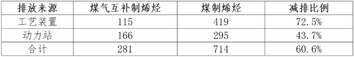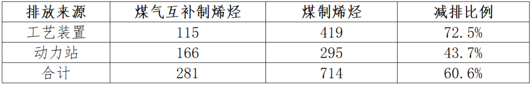 表1 同規(guī)模煤氣互補(bǔ)與煤制烯烴碳排放量對(duì)比表  單位:萬(wàn)噸/年