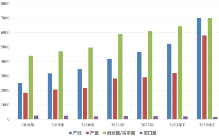 2022年,我國(guó)丙烯產(chǎn)能約5611萬(wàn)噸/年,產(chǎn)量4604萬(wàn)噸,表觀消費(fèi)量約4834萬(wàn)噸,進(jìn)口量約230萬(wàn)噸,自給率超過95%。