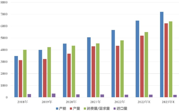 截至2022年底,我國(guó)乙烯產(chǎn)能達(dá)到4675萬(wàn)噸/年,產(chǎn)量4168萬(wàn)噸,進(jìn)口量206萬(wàn)噸,當(dāng)量消費(fèi)量6250萬(wàn)噸,當(dāng)量自給率提升至66.7%,已成為全球最大的乙烯產(chǎn)能和消費(fèi)國(guó)。