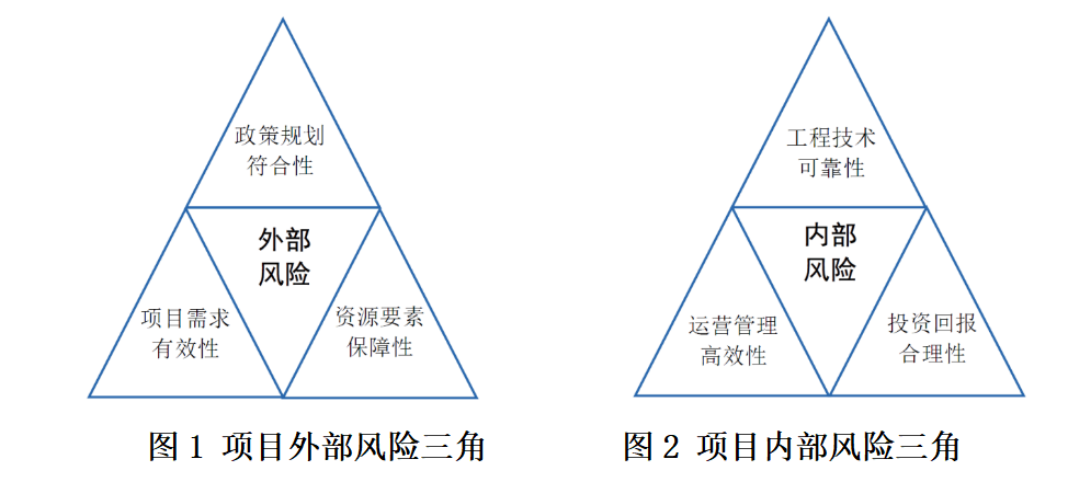 基于以上6個方面,形成項目外部風(fēng)險三角圖和項目內(nèi)部風(fēng)險三角圖。其中項目外部風(fēng)險,主要包括政策規(guī)劃符合性、資源要素保障性、項目需求有效性;項目內(nèi)部風(fēng)險主要包括工程技術(shù)可靠性、運營管理高效性、投資回報合理性。任何一個方面出現(xiàn)問題,都會影響項目的投資建設(shè)運營和可持續(xù)發(fā)展。因此,必須全面分析項目潛在的各種風(fēng)險,制定有效的風(fēng)險應(yīng)對措施,切實降低風(fēng)險不利影響,將風(fēng)險控制在可控的范圍內(nèi)。
