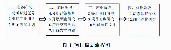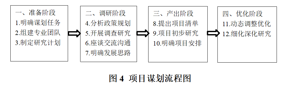 項目謀劃的基本流程包括準(zhǔn)備、調(diào)研、產(chǎn)出和優(yōu)化四個階段,不同的專業(yè)咨詢機(jī)構(gòu)可能會進(jìn)一步細(xì)分為不同的環(huán)節(jié),我們認(rèn)為,完整的項目謀劃應(yīng)該包括四個階段12個環(huán)節(jié)。