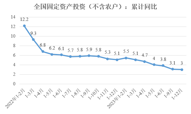 2023年,我國固定資產(chǎn)投資(不含農(nóng)戶)同比增長3%,增速較上年下降2.1個百分點,較前三季度、上半年、一季度分別下降0.1個、0.8個、2.1個百分點,固定資產(chǎn)投資增速逐季放緩。1—11月,建安工程、設(shè)備工器具購置、其他費用分別增長2.1%、6.7%、3.1%,建安工程投資增速明顯低于設(shè)備工器具購置投資增速,說明房屋、建筑物和設(shè)備裝置安裝等投資的活躍程度有所下降,體現(xiàn)技術(shù)水平的設(shè)備工器具投入增長加快。