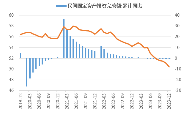 (一)民間投資動力不足。2023年,新冠疫情防控平穩(wěn)轉(zhuǎn)段,疫情產(chǎn)生的“疤痕效應(yīng)”仍待消除,需求收縮、供給沖擊、預(yù)期轉(zhuǎn)弱三重壓力尚在,民營企業(yè)面臨市場競爭加劇、利潤率下降、轉(zhuǎn)型升級難度增大、融資難融資貴等突出困難。全年民間固定資產(chǎn)投資253544億元,同比下降0.4%,較上年低了1.3個百分點,低于投資整體增速3.4個百分點。截至2023年12月底,我國民間固定資產(chǎn)投資已連續(xù)8個月負(fù)增長,民間固定資產(chǎn)投資占比連續(xù)7個月下降,跌至2011年以來的最低點,僅為50.4%,民間投資信心有待進(jìn)一步提振。