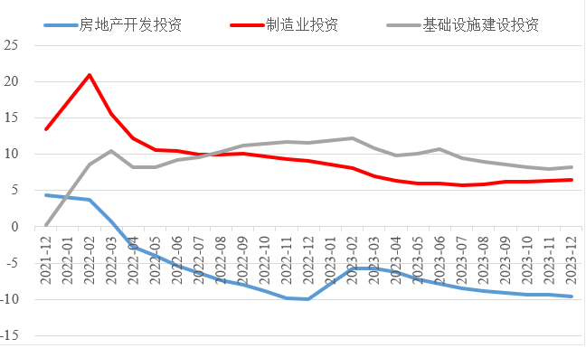 (一)房地產(chǎn)供求關(guān)系深度調(diào)整從根本上制約著房地產(chǎn)投資的增長。2023年初,隨著疫情防控平穩(wěn)轉(zhuǎn)段后的積壓需求較快釋放,我國房地產(chǎn)銷售出現(xiàn)一些積極變化;但在房地產(chǎn)市場供求關(guān)系發(fā)生重大變化的背景下,前期積壓的需求釋放完畢疊加居民收入增長預(yù)期尚未完全修復(fù),房地產(chǎn)市場銷售和投資跌幅逐步擴(kuò)大。2023年12月,70個大中城市二手住宅價格環(huán)比全部下跌,是自2014年10月以來首次全部下跌。房價普遍持續(xù)下降導(dǎo)致短期調(diào)控政策難以有效刺激居民購房需求,2023年我國商品房銷售面積同比下降8.5%,降幅較一季度、上半年和前三季度分別擴(kuò)大6.7、3.2、1個百分點。受供給結(jié)構(gòu)性過剩和需求階段性不足影響,自2022年4月以來,房地產(chǎn)開發(fā)投資持續(xù)負(fù)增長,2023年房地產(chǎn)開發(fā)投資降幅較一季度、上半年和前三季度分別提高3.8個、1.7個、0.5個百分點,降幅逐季擴(kuò)大。