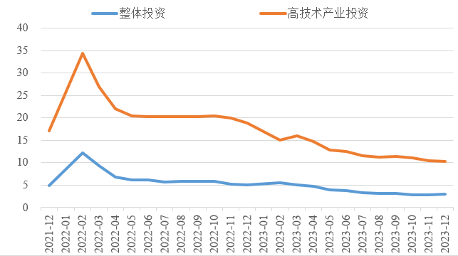 圖4  高技術(shù)產(chǎn)業(yè)投資增速對比整體投資增速(累計同比,%)