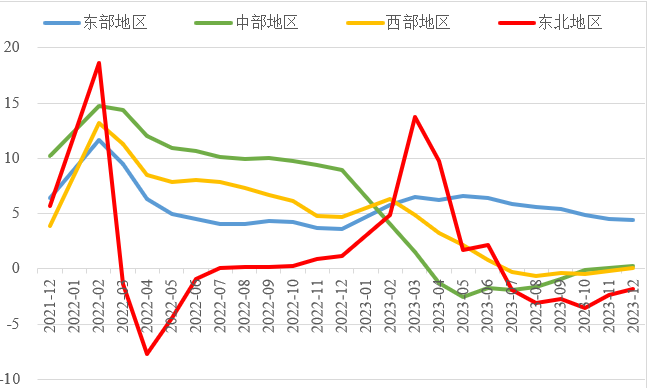 (三)東部地區(qū)投資保持較快增長,東北地區(qū)投資延續(xù)負(fù)增長。今年以來,中咨公司承接31個省市委托的項目中,東部、中部、西部和東北地區(qū)占比分別為43%、16%、36%、5%。2023年,我國東部地區(qū)投資同比增長4.4%,較全國水平高了1.4個百分點;中部、西部地區(qū)投資增速由負(fù)轉(zhuǎn)正,分別同比增長0.3%、0.1%;東北地區(qū)投資同比下降1.8%,降幅較前三季度有所收窄。