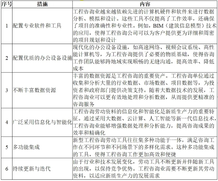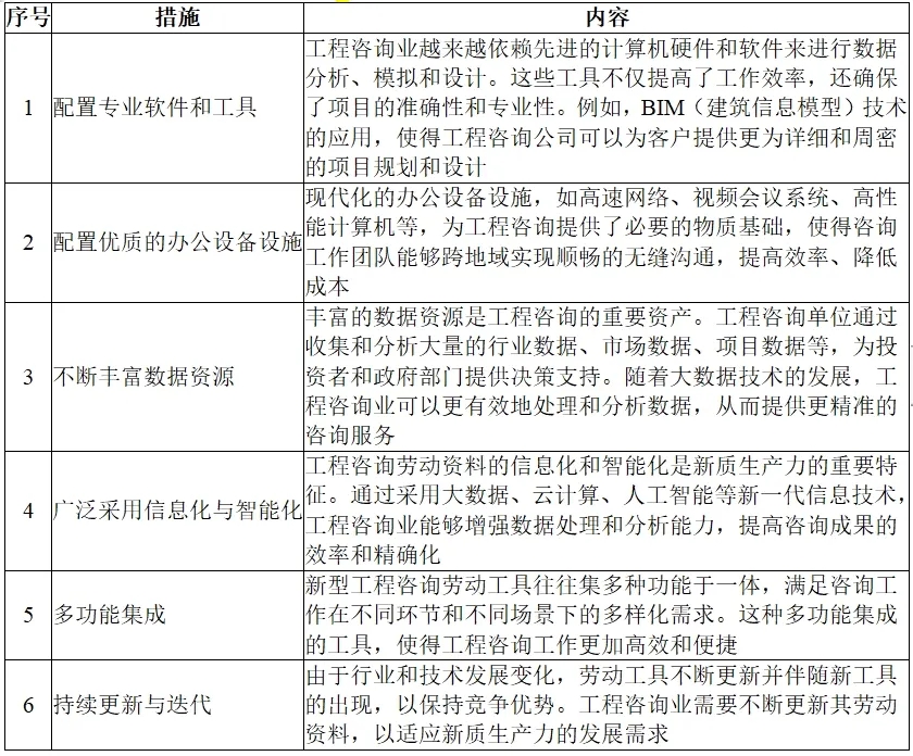 因此,隨著新質(zhì)生產(chǎn)力的不斷進步,工程咨詢領(lǐng)域的勞動資料也需不斷升級與更新,以更加高效、便捷的服務(wù)手段和設(shè)施,為咨詢工作的順利開展奠定堅實基礎(chǔ)。