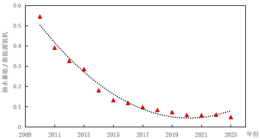 由圖1可見,抽水蓄能相比于電力和新能源的裝機規(guī)模增長明顯偏慢。圖2和圖3分別顯示新能源和抽水蓄能“十二五”以來裝機規(guī)模的增長情況,雖然抽水蓄能占電力總裝機比例總體維持在1.7%左右,但相比于新能源規(guī)模年均34%的增產(chǎn)率,抽水蓄能年均增長率僅有9.6%。圖4顯示了2010年以來抽水蓄能與新能源裝機對比變化情況,二者裝機比例從2010年的54%下滑至2023年的4.8%。