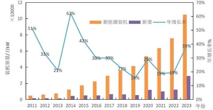 圖2 2011-2023年我國新能源裝機規(guī)模變化趨勢