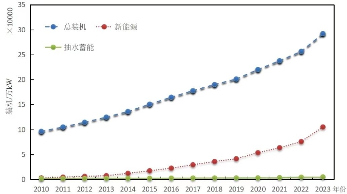 圖1 我國電力、新能源和抽水蓄能裝機規(guī)模增長情況