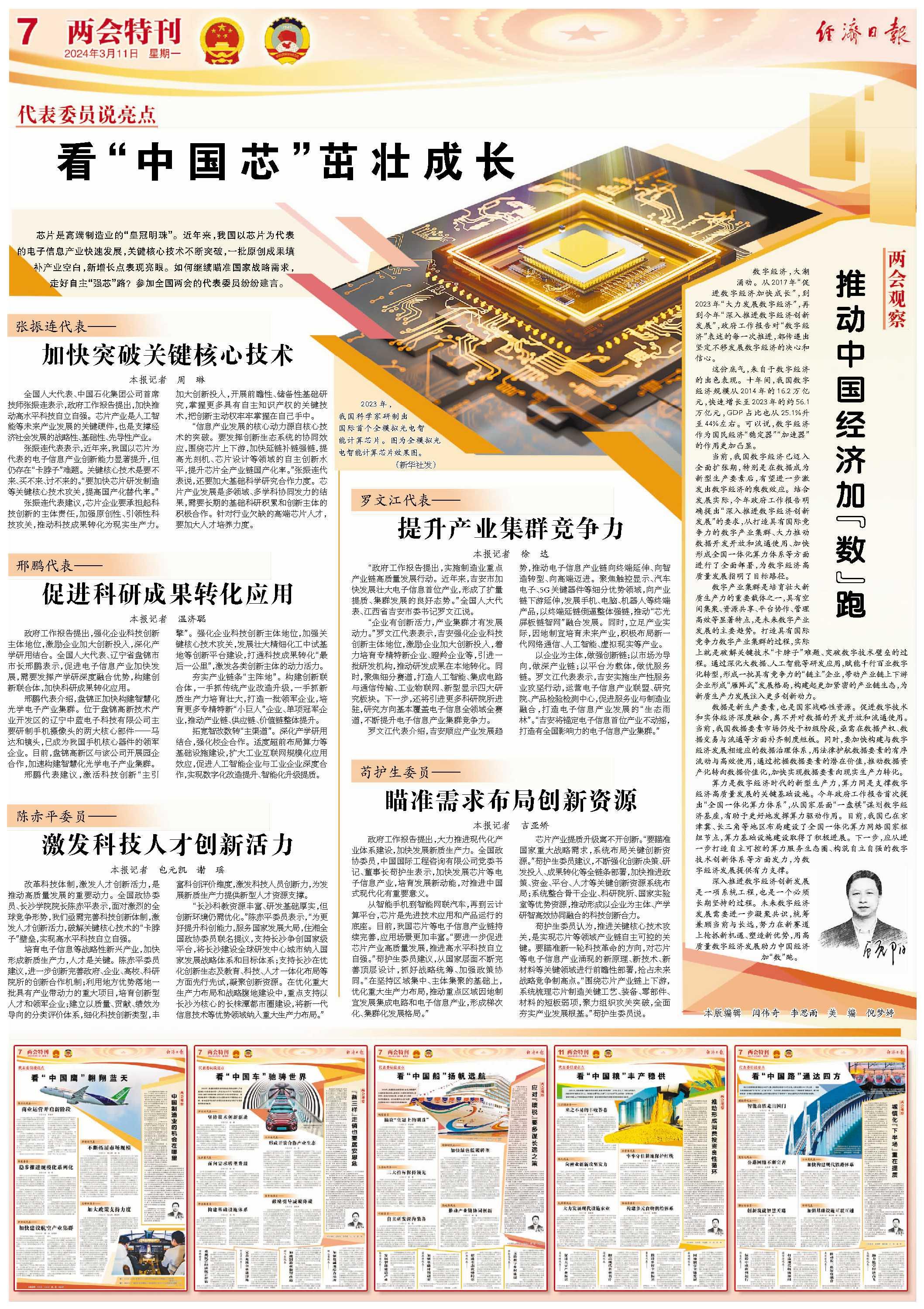 本文刊發(fā)于《經濟日報》2024年3月11日第7版兩會特刊 政府工作報告提出,大力推進現代化產業(yè)體系建設,加快發(fā)展新質生產力。全國政協委員,中國國際工程咨詢有限公司黨委書記、董事長茍護生表示,加快發(fā)展芯片等電子信息產業(yè),培育發(fā)展新動能,對推進中國式現代化有重要意義。 從智能手機到智能網聯汽車,再到云計算平臺,芯片是先進技術應用和產品運行的底座。目前,我國芯片等電子信息產業(yè)鏈持續(xù)完善,應用場景更加豐富?!耙M一步促進芯片產業(yè)高質量發(fā)展,推進高水平科技自立自強?!逼堊o生委員建議,從國家層面不斷完善頂層設計,抓好戰(zhàn)略統籌、加強政策協同?!霸趫猿謪^(qū)域集中、主體集聚的基礎上,優(yōu)化重大生產力布局,推動重點區(qū)域因地制宜發(fā)展集成電路和電子信息產業(yè),形成梯次化、集群化發(fā)展格局?!?/p> 芯片產業(yè)提質升級離不開創(chuàng)新?!耙闇蕠抑卮髴?zhàn)略需求,系統布局關鍵創(chuàng)新資源?!逼堊o生委員建議,不斷強化創(chuàng)新決策、研發(fā)投入、成果轉化等全鏈條部署,加快推進政策、資金、平臺、人才等關鍵創(chuàng)新資源系統布局;系統整合骨干企業(yè)、科研院所、國家實驗室等優(yōu)勢資源,推動形成以企業(yè)為主體、產學研智高效協同融合的科技創(chuàng)新合力。 茍護生委員認為,推進關鍵核心技術攻關,是實現芯片等領域產業(yè)鏈自主可控的關鍵。要瞄準新一輪科技革命的方向,對芯片等電子信息產業(yè)涌現的新原理、新技術、新材料等關鍵領域進行前瞻性部署,搶占未來戰(zhàn)略競爭制高點?!皣@芯片產業(yè)鏈上下游,系統梳理芯片制造關鍵工藝、裝備、零部件、材料的短板弱項,聚力組織攻關突破,全面夯實產業(yè)發(fā)展根基?!逼堊o生委員說。(經濟日報記者 吉亞矯) | |||||