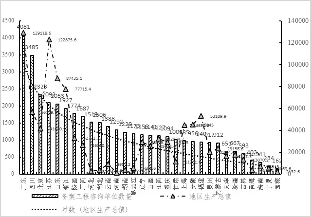 圖2 我國各省市工程咨詢單位數(shù)量分布情況