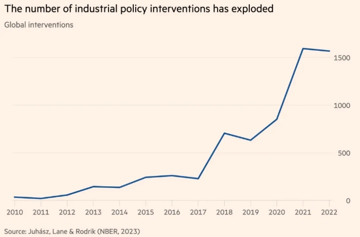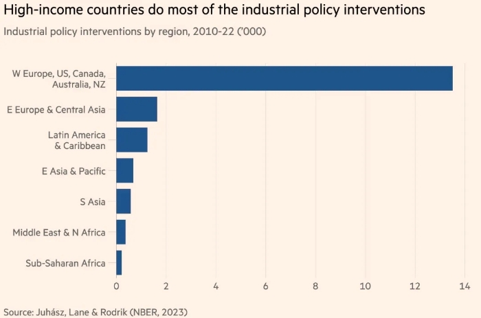 有證據(jù)表明,產(chǎn)業(yè)政策作為一種理念和實(shí)踐都變得更加普遍。國(guó)際貨幣基金組織去年 1 月發(fā)布的《產(chǎn)業(yè)政策回歸數(shù)據(jù)》顯示,過去十年,商業(yè)媒體中對(duì)產(chǎn)業(yè)政策的提及顯著增加。美國(guó)國(guó)家經(jīng)濟(jì)研究局發(fā)表的一篇關(guān)于《產(chǎn)業(yè)政策的新經(jīng)濟(jì)學(xué)》的論文由雷卡·尤哈斯、內(nèi)森·萊恩和丹尼·羅德里克共同撰寫,論文顯示,全球產(chǎn)業(yè)政策干預(yù)措施急劇增加,從2017年的228項(xiàng)增加到2022年的1568項(xiàng)——主要是在高收入國(guó)家(可能是因?yàn)樗鼈冇懈嗟呢?cái)政空間)。這也讓世界其他國(guó)家指責(zé)它們虛偽。(見圖1)