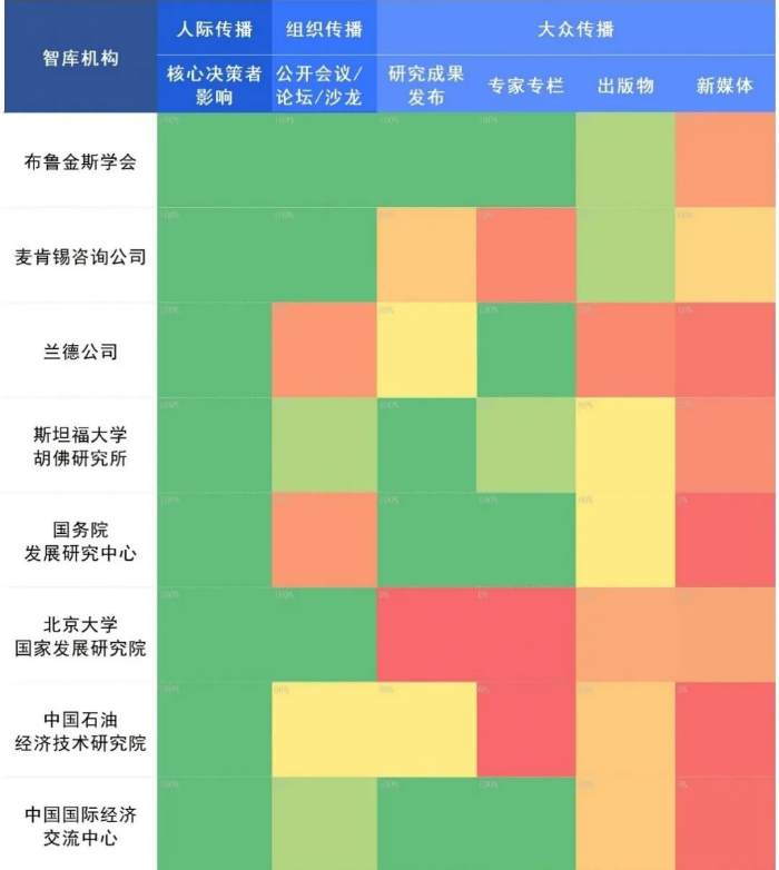 圖1 部分智庫傳播方式分布情況(綠色為好)
