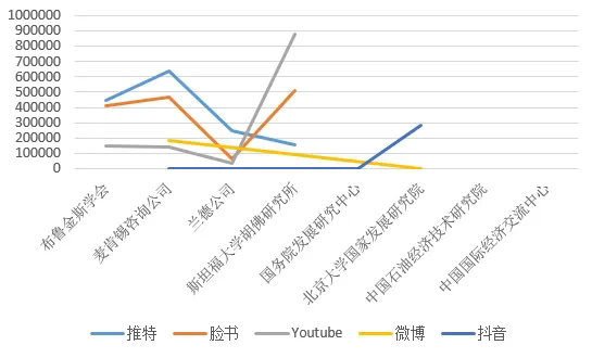 隨著互聯(lián)網(wǎng)和大數(shù)據(jù)時代的到來,新媒體矩陣作為大眾傳播有效和經(jīng)濟(jì)的方式,越來越受到重視。分析中選取了主流國際和國內(nèi)新媒體典型代表(信息類推特、微博、臉書、微信,以及流媒體類Youtube及抖音),通過對訂閱者數(shù)量、發(fā)布數(shù)量、日發(fā)布頻率、閱讀/觀看次數(shù)、獲贊數(shù)量等指標(biāo)進(jìn)行綜合量化分析,構(gòu)建了國內(nèi)外智庫的新媒體矩陣綜合影響力模型(見圖2、圖3、圖4、圖5)。