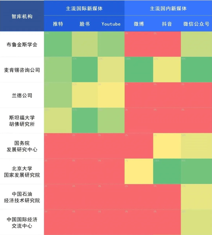 圖5 部分智庫新媒體矩陣綜合影響力熱度圖(綠色為好)