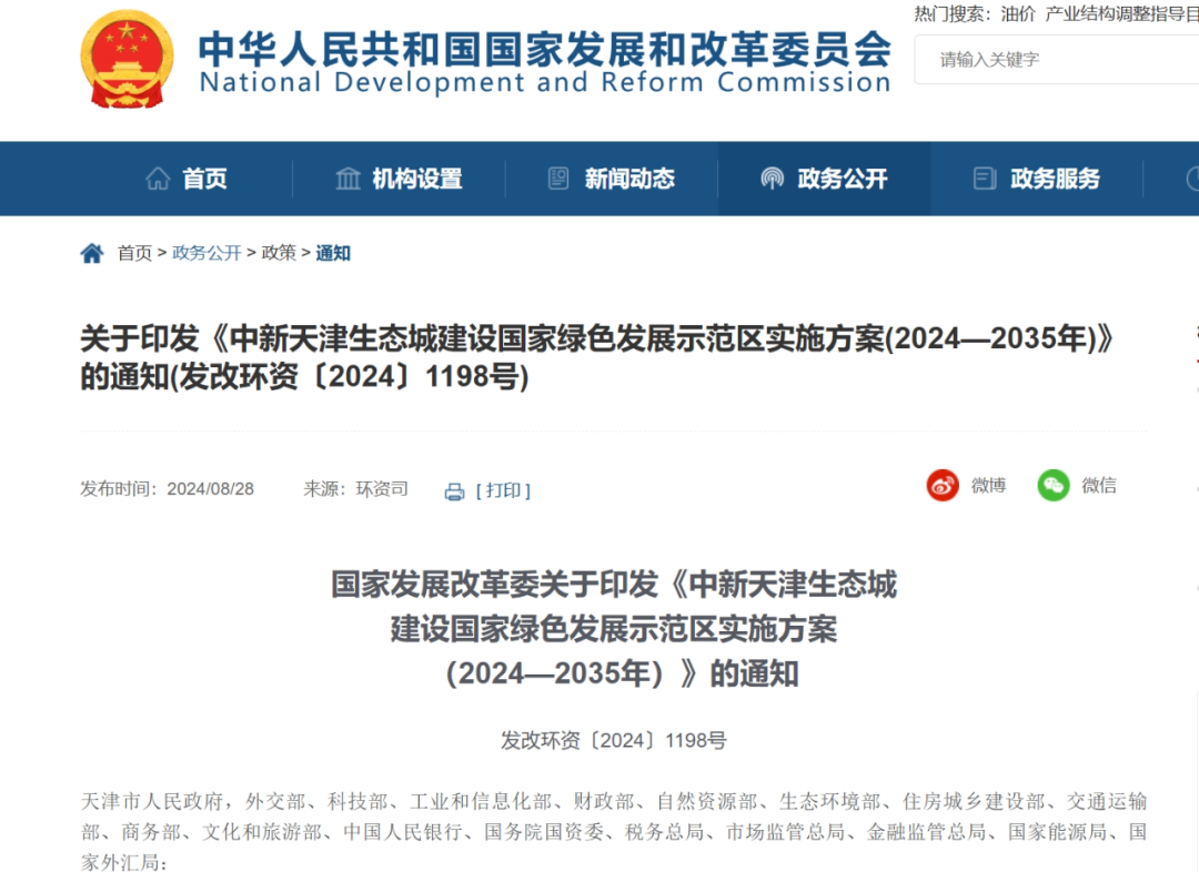 發(fā)揮中新合作平臺(tái)優(yōu)勢(shì) 高標(biāo)準(zhǔn)高質(zhì)量建設(shè)國(guó)家綠色發(fā)展示范區(qū) ——《中新天津生態(tài)城建設(shè)國(guó)家綠色發(fā)展示范區(qū)實(shí)施方案(2024—2035年)》解讀 朱黎陽(yáng) 范瑩瑩 近日,經(jīng)國(guó)務(wù)院批復(fù)同意,國(guó)家發(fā)展改革委印發(fā)《中新天津生態(tài)城建設(shè)國(guó)家綠色發(fā)展示范區(qū)實(shí)施方案(2024—2035年)》(發(fā)改環(huán)資〔2024〕1198號(hào),以下簡(jiǎn)稱《方案》),立足新形勢(shì)新要求,從多個(gè)維度對(duì)下一階段中新天津生態(tài)城(以下簡(jiǎn)稱生態(tài)城)建設(shè)國(guó)家綠色發(fā)展示范區(qū)升級(jí)版的目標(biāo)任務(wù)作出了全面系統(tǒng)部署。 01、《方案》是新征程上生態(tài)城綠色發(fā)展的施工圖 2013年,生態(tài)城成為首個(gè)國(guó)家綠色發(fā)展示范區(qū)。2013年5月,習(xí)近平總書記在生態(tài)城視察時(shí)強(qiáng)調(diào),“生態(tài)城要兼顧好先進(jìn)性、高端化和能復(fù)制、可推廣兩個(gè)方面,在體現(xiàn)人與人、人與經(jīng)濟(jì)活動(dòng)、人與環(huán)境和諧共存等方面作出有說(shuō)服力的回答,為建設(shè)資源節(jié)約型、環(huán)境友好型社會(huì)提供示范”。十多年以來(lái),生態(tài)城認(rèn)真貫徹落實(shí)習(xí)近平總書記對(duì)天津及生態(tài)城的重要指示精神,全力推動(dòng)國(guó)家綠色發(fā)展示范區(qū)建設(shè)取得豐碩成果,從鹽堿荒灘蛻變成生態(tài)之城、智慧之城、幸福之城,成為生態(tài)文明建設(shè)的示范區(qū)、綠色發(fā)展體制機(jī)制的創(chuàng)新區(qū)和綠色思想文化的策源地。 在新征程的新起點(diǎn)上,《方案》提出了生態(tài)城新十年建設(shè)國(guó)家綠色發(fā)展示范區(qū)“3+20”的任務(wù)目標(biāo)體系。確立了綠色發(fā)展的三項(xiàng)示范任務(wù),一是要在綠色低碳產(chǎn)業(yè)效益上發(fā)揮先導(dǎo)帶動(dòng)作用,形成具有國(guó)際競(jìng)爭(zhēng)優(yōu)勢(shì)的綠色低碳產(chǎn)業(yè)集群,單位地區(qū)生產(chǎn)總值二氧化碳排放水平保持領(lǐng)先;二是在綠色低碳創(chuàng)新能力上發(fā)揮先行引領(lǐng)作用,培育一批綠色低碳技術(shù)創(chuàng)新載體和平臺(tái),取得一批綠色低碳技術(shù)知識(shí)產(chǎn)權(quán),形成綠色低碳高質(zhì)量發(fā)展技術(shù)和標(biāo)準(zhǔn)支撐體系;三是在綠色低碳開放合作上發(fā)揮重要牽引作用,打造產(chǎn)業(yè)合作、技術(shù)轉(zhuǎn)移、人才培養(yǎng)平臺(tái),建設(shè)綠色低碳領(lǐng)域國(guó)際合作重要樞紐。同時(shí),《方案》還結(jié)合生態(tài)城發(fā)展實(shí)際,提出了20項(xiàng)具體指標(biāo),部分指標(biāo)達(dá)到國(guó)際領(lǐng)先水平,比如,單位GDP二氧化碳排放量,我國(guó)的平均水平約1噸二氧化碳/萬(wàn)元,發(fā)達(dá)國(guó)家水平約為0.2噸二氧化碳/萬(wàn)元,生態(tài)城目前是0.27噸二氧化碳/萬(wàn)元,2035年目標(biāo)值是0.2噸二氧化碳/萬(wàn)元以下。此外,還有一些指標(biāo)也具有較強(qiáng)的先進(jìn)性,比如,到2035年,研發(fā)經(jīng)費(fèi)投入強(qiáng)度翻倍,綠電占全社會(huì)用電量比重達(dá)到近100%。這些任務(wù)和指標(biāo)不僅體現(xiàn)了國(guó)家對(duì)生態(tài)城未來(lái)發(fā)展的高要求,也彰顯了生態(tài)城在綠色發(fā)展領(lǐng)域的國(guó)際視野和雄心壯志。 當(dāng)前,我國(guó)已經(jīng)開啟全面建設(shè)社會(huì)主義現(xiàn)代化國(guó)家新征程,我們要建設(shè)的現(xiàn)代化是人與自然和諧共生的現(xiàn)代化,要加快經(jīng)濟(jì)社會(huì)發(fā)展全面綠色轉(zhuǎn)型。8月11日,中共中央、國(guó)務(wù)院印發(fā)《關(guān)于加快經(jīng)濟(jì)社會(huì)發(fā)展全面綠色轉(zhuǎn)型的意見(jiàn)》,提出將綠色轉(zhuǎn)型的要求融入經(jīng)濟(jì)社會(huì)發(fā)展全局,全方位、全領(lǐng)域、全地域推進(jìn)綠色轉(zhuǎn)型,形成節(jié)約資源和保護(hù)環(huán)境的空間格局、產(chǎn)業(yè)結(jié)構(gòu)、生產(chǎn)方式、生活方式?!斗桨浮妨⒆阈滦蝿?shì)新要求,深入貫徹黨的二十大和二十屆二中、三中全會(huì)精神,認(rèn)真貫徹習(xí)近平生態(tài)文明思想,重新布局生態(tài)城綠色發(fā)展的目標(biāo)任務(wù),提出打造以綠色低碳高質(zhì)量發(fā)展為主線、以高附加值細(xì)分產(chǎn)業(yè)為重點(diǎn)、以國(guó)際一流營(yíng)商環(huán)境為特征的國(guó)家綠色發(fā)展示范區(qū),推動(dòng)綠色發(fā)展理念融入生態(tài)城經(jīng)濟(jì)社會(huì)發(fā)展各領(lǐng)域全過(guò)程,為加快經(jīng)濟(jì)社會(huì)發(fā)展全面綠色轉(zhuǎn)型探索新路徑。 02、《方案》充分發(fā)揮中新合作平臺(tái)優(yōu)勢(shì),建設(shè)綠色低碳開放合作的新高地 黨的二十屆三中全會(huì)提出,開放是中國(guó)式現(xiàn)代化的鮮明標(biāo)識(shí)。必須堅(jiān)持對(duì)外開放基本國(guó)策,堅(jiān)持以開放促改革,依托我國(guó)超大規(guī)模市場(chǎng)優(yōu)勢(shì),在擴(kuò)大國(guó)際合作中提升開放能力,建設(shè)更高水平開放型經(jīng)濟(jì)新體制。生態(tài)城作為中國(guó)和新加坡兩國(guó)政府間重大合作項(xiàng)目,是世界上首個(gè)