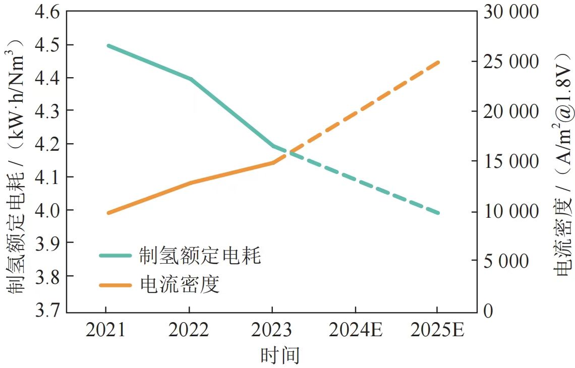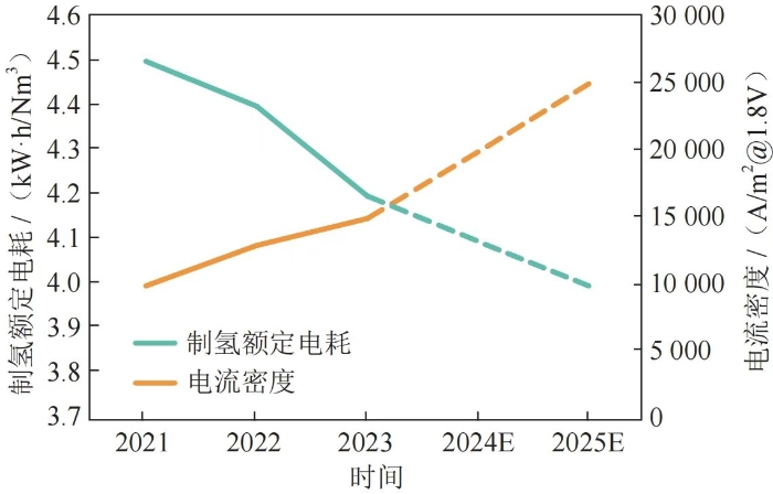 圖2 2021-2025年中國(guó)堿性電解槽制氫電耗及電流密度發(fā)展趨勢(shì)