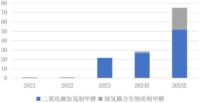 圖4 2021-2025年中國(guó)低碳甲醇產(chǎn)能(不含耦合煤化工制甲醇)