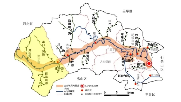 門頭溝區(qū)是北京唯一的純山區(qū),山地面積占比達(dá)98%,地形呈魚骨刺狀,沿著一條大溝主脈向兩側(cè)延伸出一條條支脈溝域,構(gòu)成了門頭溝不同的溝域單元,大部分村鎮(zhèn)分布在門頭溝1條主溝域廊道和18條溝域分支上形成“葡萄串”分布格局。清水鎮(zhèn)鎮(zhèn)域范圍內(nèi)有4條溝域,包括龍門澗溝、靈山溝、達(dá)摩溝和百花山溝,溝域一端與主溝相連,另一端與自然風(fēng)景區(qū)相連。清水鎮(zhèn)每條溝域分布有4-10個(gè)村莊,其中龍門澗溝分布有梁家莊、臺上、李家莊、燕家臺四個(gè)村落,形成了鄉(xiāng)村獨(dú)特的景觀風(fēng)貌,也為鄉(xiāng)村聯(lián)動發(fā)展提供了良好的地域環(huán)境和交通條件。