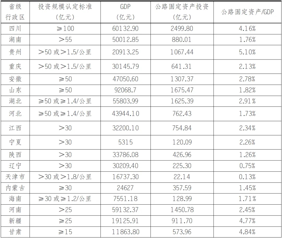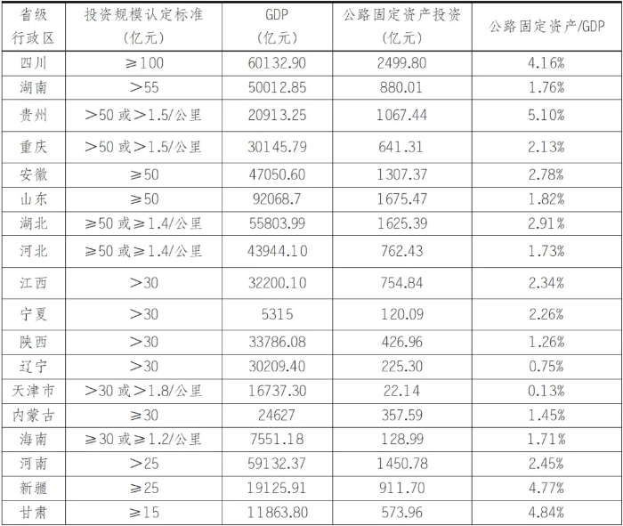 編者按:2023年11月,《關(guān)于規(guī)范實施政府和社會資本合作新機制的指導(dǎo)意見》(國辦函〔2023〕115號)發(fā)布,投資規(guī)模大、建設(shè)難度高的收費公路等項目被列為“積極創(chuàng)造條件、支持民營企業(yè)參與”的項目,不強制要求民營企業(yè)在PPP項目公司具體持股比例。除此類項目外,其他收費公路項目需滿足“民營企業(yè)股權(quán)占比原則上不低于35%”。PPP新機制發(fā)布近兩年來,各地陸續(xù)出臺對“投資規(guī)模大、建設(shè)難度高”收費公路項目量化認定標(biāo)準(zhǔn)。本研究系統(tǒng)梳理截至2025年9月底全國各地已正式發(fā)布的全部官方標(biāo)準(zhǔn),基于投資規(guī)模與建設(shè)難度兩個維度開展比較分析。各地出臺的認定標(biāo)準(zhǔn)是PPP新機制下地方政府精細化、差異化治理的具體實踐,為市場主體提供了投資指引,同時成為觀察區(qū)域基建重點與政策導(dǎo)向的重要窗口。本文是PPP新機制觀察系列研究:收費公路“投資規(guī)模大、建設(shè)難度高”認定標(biāo)準(zhǔn)的第一部分,闡述認定標(biāo)準(zhǔn)發(fā)布整體情況,分析“投資規(guī)模大”的具體界定標(biāo)準(zhǔn),供業(yè)界同仁參考。 “PPP新機制觀察”系列研究 收費公路“投資規(guī)模大”認定標(biāo)準(zhǔn) 郭艷鑫 張雪飛 伍迪 摘要:本研究系統(tǒng)梳理截至2025年9月底全國各地已正式發(fā)布的“投資規(guī)模大、建設(shè)難度高”收費公路項目認定標(biāo)準(zhǔn),研究發(fā)現(xiàn),在“投資規(guī)模大”方面,投資規(guī)模閾值分布于15億元至100億元之間,其設(shè)定與地方GDP、公路固定資產(chǎn)投資等經(jīng)濟指標(biāo)呈現(xiàn)正相關(guān),反映地方經(jīng)濟實力與基建需求的深層影響,本文為理解地方PPP治理邏輯、區(qū)域差異及政策協(xié)同提供了實踐依據(jù)。 關(guān)鍵詞:PPP;特許經(jīng)營;新機制;收費公路;投資規(guī)模大;建設(shè)難度高;認定標(biāo)準(zhǔn);區(qū)域差異 2023年11月,國務(wù)院辦公廳轉(zhuǎn)發(fā)國家發(fā)展改革委、財政部《關(guān)于規(guī)范實施政府和社會資本合作新機制的指導(dǎo)意見》(國辦函〔2023〕115號,以下簡稱《指導(dǎo)意見》),標(biāo)志著我國政府和社會資本合作(PPP)事業(yè)邁入全新發(fā)展階段。PPP新機制明確三大核心導(dǎo)向,即社會資本優(yōu)先選擇民營企業(yè)、回報機制聚焦使用者付費、實施模式全部采用特許經(jīng)營。其中,最大程度鼓勵民營企業(yè)參與,既是貫徹落實黨中央、國務(wù)院決策部署的關(guān)鍵舉措,也是引導(dǎo)市場回歸PPP初衷本源、進一步調(diào)動民間投資積極性的重要抓手。 《指導(dǎo)意見》明確,“最大程度鼓勵民營企業(yè)參與政府和社會資本合作新建(含改擴建)項目”,這一要求既契合我國引入PPP模式的初衷,也順應(yīng)了當(dāng)前激發(fā)民間資本投資活力的客觀需求。同時,考慮到國有企業(yè)是我國市場主體的重要組成部分,《指導(dǎo)意見》并未對國有企業(yè)參與PPP項目采取“一刀切”式禁止,而是制定了《支持民營企業(yè)參與的特許經(jīng)營新建(含改擴建)項目清單(2023年版)》(以下簡稱《清單》)。該《清單》依據(jù)市場化程度、公共屬性強弱、是否具備自然壟斷性等特征,對新建(含改擴建)項目進行分類設(shè)置民營企業(yè)參與要求,將“屬于市場的還給市場”,充分體現(xiàn)新機制在兼顧PPP項目公益性的同時、最大化釋放市場效率的政策導(dǎo)向。具體而言,市場化程度較高、公共屬性較弱的項目,應(yīng)由民營企業(yè)獨資或控股;關(guān)系國計民生、公共屬性較強的項目,民營企業(yè)股權(quán)占比原則上不低于35%;少數(shù)涉及國家安全、公共屬性強且具備自然壟斷屬性的項目,需積極創(chuàng)造條件支持民營企業(yè)參與。 值得關(guān)注的是,《清單》對收費公路項目的分類較為特殊:不符合“投資規(guī)模大、建設(shè)難度高”情形的收費公路項目,歸為“關(guān)系國計民生、公共屬性較強”的第二類項目,民營企業(yè)股權(quán)占比原則上不低于35%;“投資規(guī)模大、建設(shè)難度高”的收費公路等項目,則歸為第三類項目,需通過積極創(chuàng)造條件支持民營企業(yè)參與,但未強制要求民營企業(yè)參股比例。 為明確“投資規(guī)模大、建設(shè)難度高”的認定邊界,部分地區(qū)陸續(xù)公開發(fā)布收費公路項目量化認定細則。截至2025年9月底,全國已有19個省級行政區(qū)和計劃單列市出臺了收費公路“投資規(guī)模大、建設(shè)難度高”認定標(biāo)準(zhǔn)(以下簡稱認定標(biāo)準(zhǔn)),不同區(qū)域的認定標(biāo)準(zhǔn)既存在差異也具備共性。本文聚焦各地出臺的相關(guān)認定標(biāo)準(zhǔn)開展研究,并重點關(guān)注“投資規(guī)模大”維度的指標(biāo),形成若干思考,旨在為業(yè)界提供參考借鑒。 一、認定標(biāo)準(zhǔn)發(fā)布總體情況 截至2025年9月底,全國已有18個省級行政區(qū)發(fā)布收費公路“投資規(guī)模大、建設(shè)難度高”認定標(biāo)準(zhǔn)。其發(fā)布時間范圍為2024年5月至2025年5月,已發(fā)布認定標(biāo)準(zhǔn)的各省級行政區(qū)域具體如圖1所示,較深的顏色代表出臺的時間較早。另有1個計劃單列市(大連市)在2024年4月發(fā)布認定標(bi