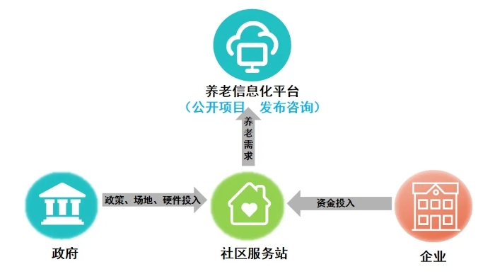 政府+企業(yè)服務(wù)+居家養(yǎng)老信息化平臺(tái)模式。在該模式中,政府主要負(fù)責(zé)提供政策、場地和硬件投入;企業(yè)負(fù)責(zé)投入資金為社區(qū)養(yǎng)老服務(wù)站提供基礎(chǔ)設(shè)施、雇傭工作人員以及支付運(yùn)營經(jīng)費(fèi),居家養(yǎng)老信息化平臺(tái)負(fù)責(zé)公開項(xiàng)目和資訊的發(fā)布,運(yùn)營模式如圖2所示。