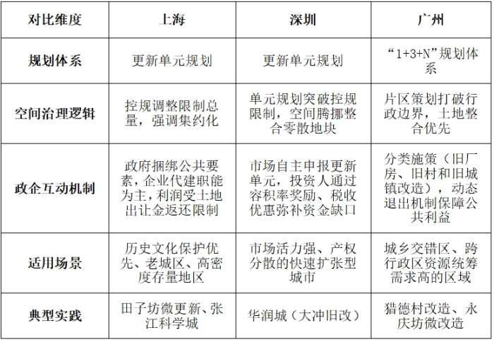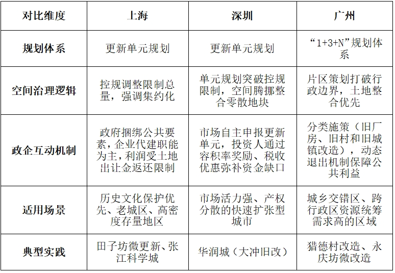 我國城市更新制度體系與經(jīng)驗分析 ——以上海、深圳、廣州為例 石延杰 摘要:隨著我國城鎮(zhèn)化進程進入存量更新階段,城市更新成為破解空間資源約束、推動高質(zhì)量發(fā)展的重要路徑。本文以國家政策框架為背景,選取上海、深圳、廣州為典型案例,系統(tǒng)梳理三地城市在制度體系、實施路徑與創(chuàng)新實踐上的更新經(jīng)驗。研究發(fā)現(xiàn),上海側(cè)重政府統(tǒng)籌下的剛性規(guī)劃與公共利益保障,深圳依托市場化政策工具,探索高強度開發(fā)與公共利益兼容機制,廣州則通過分類施策與多元主體利益協(xié)調(diào)機制破解復雜更新難題。研究建議,未來城市更新需立足城市稟賦優(yōu)化制度供給,通過健全法律體系、創(chuàng)新多元融資機制、深化公眾參與,實現(xiàn)空間治理現(xiàn)代化與經(jīng)濟、社會、文化價值的協(xié)同提升。 關鍵詞:城市更新;政策體系;經(jīng)驗分析 近年來,隨著我國城鎮(zhèn)化水平的提高,大量城市在經(jīng)歷快速擴張后逐漸面臨空間資源緊張、基礎設施老化、生態(tài)環(huán)境惡化、文化遺產(chǎn)保護壓力增大等問題。在“增量建設”空間日趨飽和的背景下,如何通過城市更新對既有建成區(qū)進行功能重塑、空間優(yōu)化與人居環(huán)境提升,成為城市高質(zhì)量發(fā)展的重要議題[1]。城市更新由此成為我國城市轉(zhuǎn)型升級過程中的關鍵抓手,既要滿足城市經(jīng)濟再增長的需求,也要兼顧文化和環(huán)境的多重價值。 一、現(xiàn)階段我國城市更新政策體系及特點 為引導各地因地制宜地實施城市更新,國家相關部門先后出臺了多項指導性文件,對城市更新的總體原則、實施路徑、管理機制等做出了明確規(guī)定。 (一)政策體系 從國家層面政策演進脈絡來看,當前城市更新制度體系主要圍繞戰(zhàn)略定位、制度約束、規(guī)劃統(tǒng)籌與保障機制四個維度展開系統(tǒng)性建構(gòu)。戰(zhàn)略導向?qū)右浴吨腥A人民共和國國民經(jīng)濟和社會發(fā)展第十四個五年規(guī)劃和2035年遠景目標綱要》為核心,明確將城市更新納入國家治理現(xiàn)代化范疇。制度約束層包含三大核心規(guī)范:住房和城鄉(xiāng)建設部《關于在實施城市更新行動中防止大拆大建問題的通知》(建科〔2021〕63號)設定拆除建筑面積比例≤20%、就地安置率≥50%等量化指標;國務院辦公廳《關于全面推進城鎮(zhèn)老舊小區(qū)改造工作的指導意見》(國辦發(fā)〔2020〕23號)建立基礎類、完善類、提升類三級改造標準;中共中央辦公廳、國務院辦公廳《關于在城鄉(xiāng)建設中加強歷史文化保護傳承的意見》明確在城市更新中進行嚴格拆除管理,禁止大拆大建。規(guī)劃統(tǒng)籌層通過自然資源部《關于開展低效用地再開發(fā)試點工作的通知》(自然資發(fā)〔2023〕171號)建立土地混合開發(fā)、容積率獎勵等存量用地政策;住房和城鄉(xiāng)建設部《關于扎實有序推進城市更新工作的通知》(建科〔2023〕30號)構(gòu)建“專項規(guī)劃編制-年度行動計劃-項目庫管理”實施體系。保障機制層包含國務院辦公廳《關于進一步盤活存量資產(chǎn)擴大有效投資的意見》(國辦發(fā)〔2022〕19號)通過吸引社會資本參與盤活城市老舊資產(chǎn)資源,特別是老舊小區(qū)改造等;財政部印發(fā)《中央財政城鎮(zhèn)保障性安居工程專項資金管理辦法》(財綜〔2024〕2號)將老舊小區(qū)改造納入補助資金支持范疇;國家發(fā)展改革委、住房城鄉(xiāng)建設部《關于加強城鎮(zhèn)老舊小區(qū)改造配套設施建設的通知》(發(fā)改投資〔2021〕1275號)明確中央預算內(nèi)投資將用于城鎮(zhèn)老舊小區(qū)改造配套設施建設項目。本體系通過戰(zhàn)略層定調(diào)、制度層劃界、規(guī)劃層操作、保障層托底的政策協(xié)同,推動城市更新從“項目驅(qū)動”向“制度驅(qū)動”轉(zhuǎn)型,體現(xiàn)了空間治理現(xiàn)代化的制度創(chuàng)新邏輯。 (二)政策特點 從這些政策演進脈絡可概括出以下幾個主要特點: 一是強調(diào)規(guī)劃先行與法制保障。城市更新項目往往牽涉空間結(jié)構(gòu)重塑、土地用途調(diào)整、利益平衡等復雜問題,需要在法規(guī)層面提供穩(wěn)固的制度支撐,以保證更新項目的合規(guī)性和可持續(xù)性[2]。為此,國務院辦公廳發(fā)布《關于全面推進城鎮(zhèn)老舊小區(qū)改造工作的指導意見》(國辦發(fā)〔2020〕23號),以分類施策為基礎(分為基礎類、完善類、提升類改造),構(gòu)建政府、居民、社會資本多方共擔的資金機制,統(tǒng)籌推進民生改善、經(jīng)濟轉(zhuǎn)型與內(nèi)需擴張,并注重長效管理與社會治理創(chuàng)新,強調(diào)居民參與和歷史文化保護;自然資源部發(fā)布《支持城市更新的規(guī)劃與土地政策指引(2023版)》(自然資辦發(fā)〔2023〕47號),要求將城市更新納入國土空間規(guī)劃體系,通過總體規(guī)劃明確更新目標、實施策略,并在詳細規(guī)劃中細化更新單元的功能定位,強調(diào)規(guī)劃剛性約束。 二是倡導多元化投融資機制。城市更新具有投入資金量大、回報周期長的特點,僅依靠政府財政難以持續(xù),需要更多社會資本的參與。住建部發(fā)布《關于開展第一批城市更新試點工作的通知》(建辦科函〔2021〕443號),提出推動試點城市探索