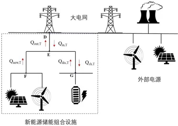 根據(jù)基爾霍夫定律,在圖2中節(jié)點(diǎn)E考慮T周期內(nèi)電量平衡,即流入和流出節(jié)點(diǎn)E的電量相等,Qnew,T+Qin,T+Qdis,T=Qout,T+Qch,T(公式1)??紤]T周期內(nèi)儲(chǔ)能設(shè)施儲(chǔ)存的能量回到初始狀態(tài),即T周期內(nèi)儲(chǔ)能設(shè)施充入的電量全部放出,t=T時(shí)刻存儲(chǔ)的能量等于t=0時(shí)刻存儲(chǔ)的能量??紤]儲(chǔ)能損耗,有Qdis,T=Qch,T·η(公式2)。