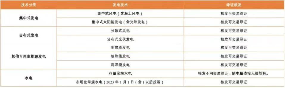 綠證作為可再生能源電力消費(fèi)憑證,用于可再生能源電力消費(fèi)量核算、可再生能源電力消費(fèi)認(rèn)證等,1個(gè)綠證單位對(duì)應(yīng)1000千瓦時(shí)可再生能源電量。國(guó)家發(fā)展改革委、財(cái)政部、國(guó)家能源局《關(guān)于做好可再生能源綠色電力證書全覆蓋工作 促進(jìn)可再生能源電力消費(fèi)的通知》(發(fā)改能源〔2023〕1044號(hào))明確綠證是我國(guó)可再生能源電量環(huán)境屬性的唯一證明,是認(rèn)定可再生能源電力生產(chǎn)、消費(fèi)的唯一憑證。并規(guī)定如表1對(duì)全國(guó)風(fēng)電(含分散式風(fēng)電和海上風(fēng)電)、太陽(yáng)能發(fā)電(含分布式光伏發(fā)電和光熱發(fā)電)、常規(guī)水電、生物質(zhì)發(fā)電、地?zé)崮馨l(fā)電、海洋能發(fā)電等已建檔立卡的可再生能源發(fā)電項(xiàng)目所生產(chǎn)的全部電量核發(fā)綠證,實(shí)現(xiàn)綠證核發(fā)全覆蓋。