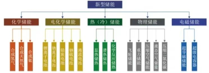 儲(chǔ)能按照技術(shù)類型可以分為化學(xué)儲(chǔ)能、電化學(xué)儲(chǔ)能、熱(冷)儲(chǔ)能、物理儲(chǔ)能(機(jī)械儲(chǔ)能)和電磁儲(chǔ)能,其中抽水蓄能屬于物理儲(chǔ)能,新型儲(chǔ)能技術(shù)可以按照下圖1進(jìn)行劃分,其中化學(xué)儲(chǔ)能包括氫儲(chǔ)能、氨儲(chǔ)能等技術(shù),電化學(xué)儲(chǔ)能包括鋰離子、鈉離子、液流電池等技術(shù),熱(冷)儲(chǔ)能包括熔鹽、熱水、冰蓄冷等技術(shù),物理儲(chǔ)能(機(jī)械儲(chǔ)能)包括飛輪、重力、壓縮空氣等技術(shù),電磁儲(chǔ)能包括超導(dǎo)、超級(jí)電容器等技術(shù)。